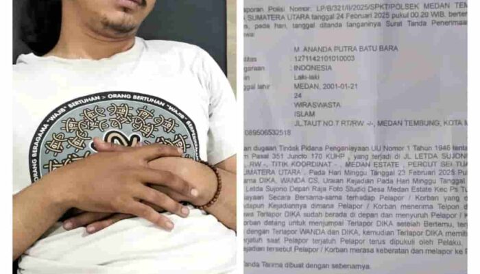 MEDAN, Metroupdate.id – Kasus penganiayaan secara bersama sama terhadap korban M.Ananda Putra Batu Bara yang dilaporkan di Polsek Medan Tembung berdasarkan Bukti Lapor: STTLP/B/321/II/2025/SPKT/POLSEK MEDAN TEMBUNG/POLRESTABES MEDAN DAN/POLDA SUMATRA UTARA, Tanggal 24 Februari 2025, hingga kini sudah dua bulan belum juga menemui titik terang, Dimana Laporan tersebut telah diterima oleh pihak kepolisian, Namun terlapor belum juga ditetapkan sebagai tersangka.